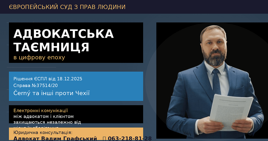 У сучасному світі, де електронні комунікації стали невід’ємною частиною професійної діяльності юристів, питання захисту адвокатської таємниці набуває нового виміру. Європейський суд з прав людини (ЄСПЛ) у грудні 2025 року виніс знакове рішення у справі «Černý та інші проти Чеської Республіки», яке встановило важливий правовий стандарт: конфіденційність комунікацій між адвокатом і клієнтом має захищатися незалежно від того, на яких пристроях зберігається листування.